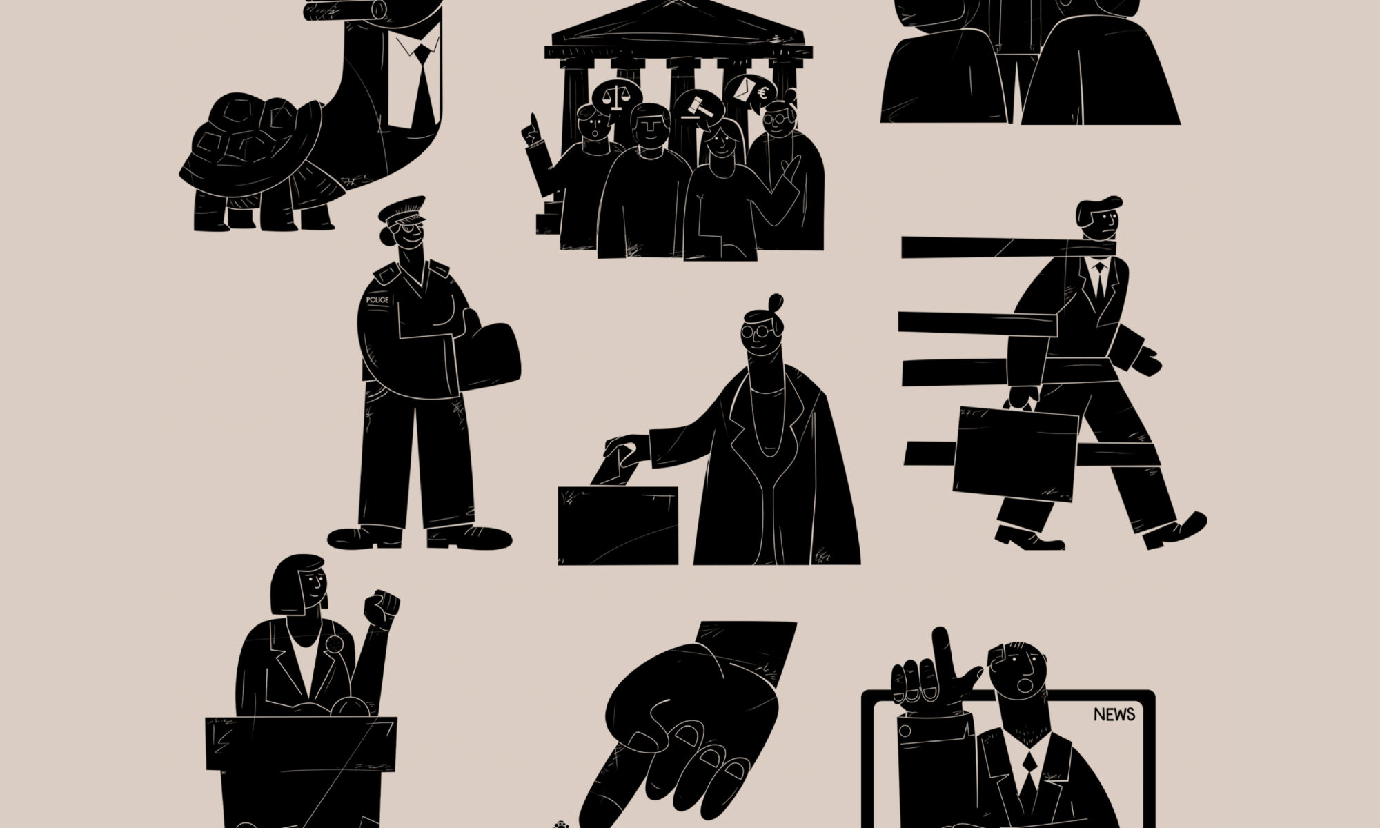 Σειρά από εικονογραφήσεις για το World Justice Project (WJP), ανεξάρτητο, μη κερδοσκοπικό οργανισμό που εργάζεται για την προώθηση του κράτους δικαίου σε όλο τον κόσμο. Με αφορμή τη δημοσίευση μιας νέας μελέτης σε πανευρωπαϊκό επίπεδο, συνεργαστήκαμε με τον οργανισμό για την επικοινωνία ενός νέου δείκτη μέτρησης του κράτους δικαίου, βάση των εμπειριών και των αντιλήψεων των πολιτών και των εμπειρογνωμόνων στα κράτη μέλη της Ευρωπαϊκής Ένωσης (ΕΕ). Τα βασικά ευρήματα αυτή της μελέτης οπικοποιήθηκαν με σαφή, άμεσο και συνοπτικό τρόπο σε μια σειρά από πολύχρωμες εικονογραφικές συνθέσεις, οι οποίες στοχεύουν στην ευαισθητοποίηση της κοινής γνώμης και των ενδιαφερόμενων μερών. Η δικαιοσύνη, η ελευθερία του τύπου, η λογοκρισία, η αστυνομική αυθαιρεσία, η διαφθορά πρωταγωνιστούν στις εικονογραφήσεις με ευφάνταστο και χιουμοριστικό τόνο, χρησιμοποιώντας την ανθρώπινη μορφή ως κεντρικό κομμάτι της αφήγησης, αλλού με συμβολικό και αλλού με κυριολεκτικό τρόπο, καλώντας μας σε διαρκή εγρήγορση.